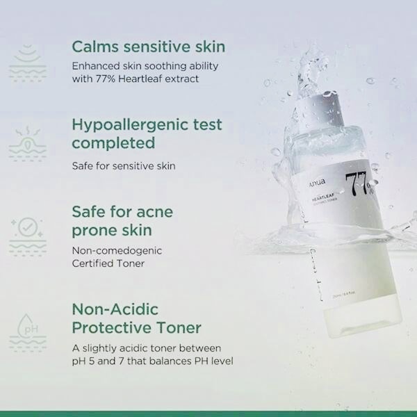 Anua Heartleaf 77% Soothing Toner is crafted to comfort and protect sensitive, easily irritated skin. With 77 percent Houttuynia Cordata extract, it helps calm visible redness, rebalance oil and moisture levels, and keep the skin feeling clear, hydrated, and steady. It’s gentle, lightweight, and perfect for daily use.