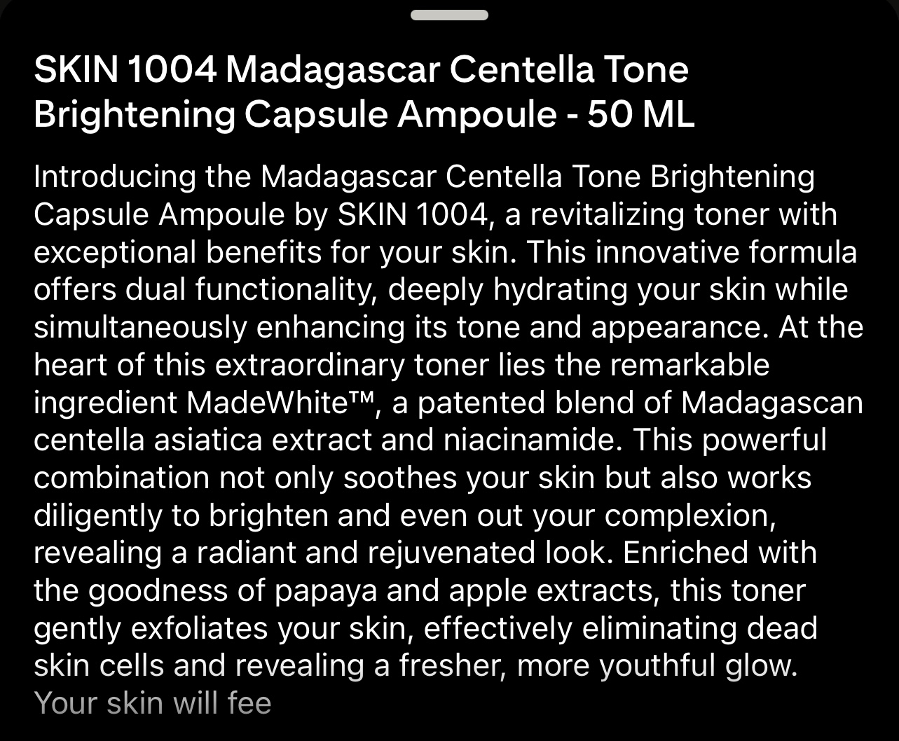 Capsule Ampoule by SKIN 1004, a revitalizing toner with exceptional benefits for your skin. This innovative formula offers dual functionality, deeply hydrating your skin while simultaneously enhancing its tone and appearance. At the heart of this extraordinary toner lies the remarkable ingredient MadeWhite™ a patented blend of Madagascan centella asiatica extract and niacinamide. This powerful combination not only soothes your skin but also works diligently to brighten and even out your complexion, revealing a radiant and rejuvenated look. Enriched with the goodness of papaya and apple extracts, this toner gently exfoliates your skin, effectively eliminating dead skin cells and revealing a fresher, more youthful glow.