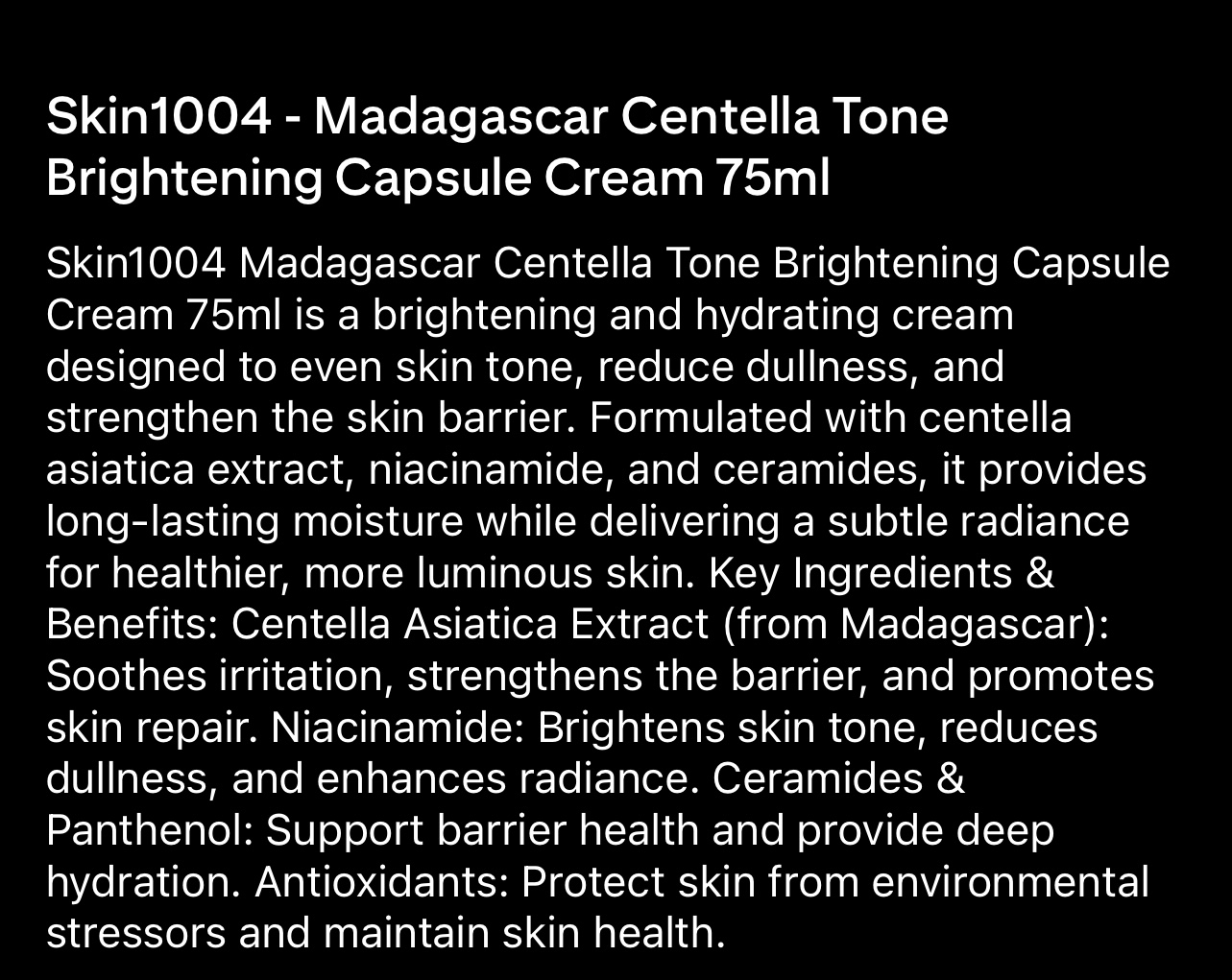Cream 75ml is a brightening and hydrating cream designed to even skin tone, reduce dullness, and strengthen the skin barrier. Formulated with centella asiatica extract, niacinamide, and ceramides, it provides long-lasting moisture while delivering a subtle radiance for healthier, more luminous skin. Key Ingredients & Benefits: Centella Asiatica Extract (from Madagascar):